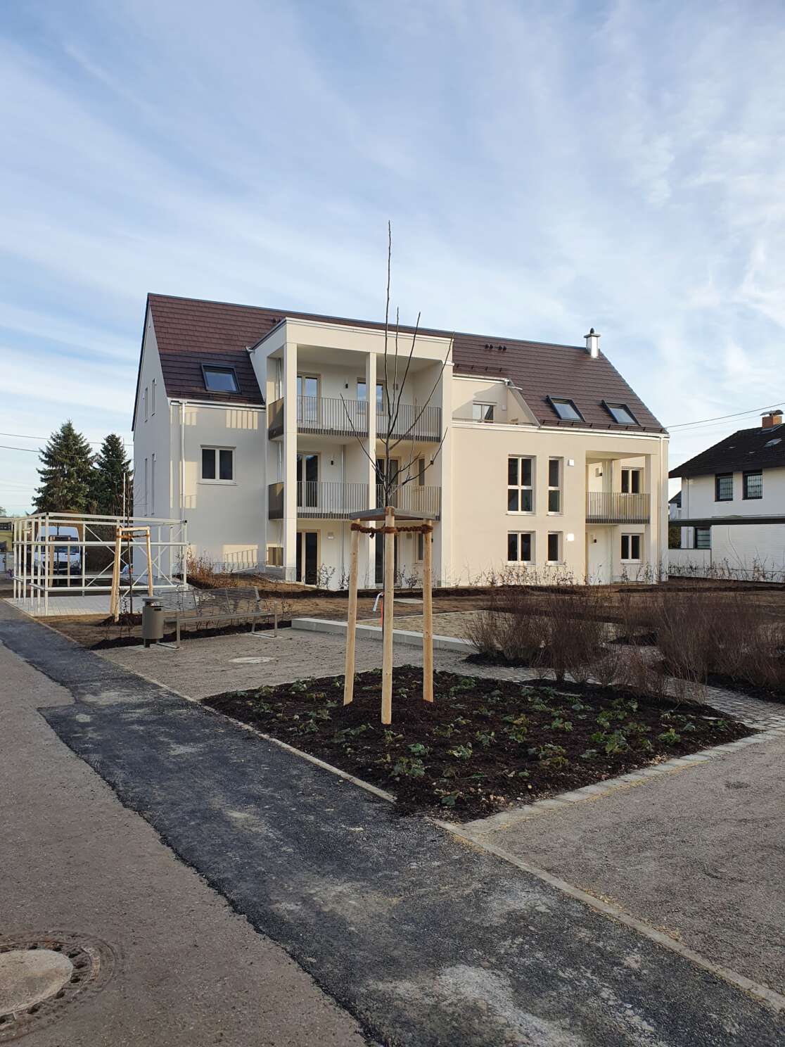 - Im Zentrum von Stadtbergen in Nähe des Rathauses, auf einem Grundstück mit einem Höhenunterschied in Ost-West Richtung von mehr als 4,0 m, gelegen, ersetzt der westliche Baukörper an der Bauernstraße den alten Pfarrhof. In Verbindung mit dem östlichen Baukörper an der Straße „Am Graben” entsteht eine öffentlich nutzbare Grünfläche einschließlich eines Kinderspielplatzes. Größe, Körnigkeit und Dachformen orientieren sich an der Umgebung.