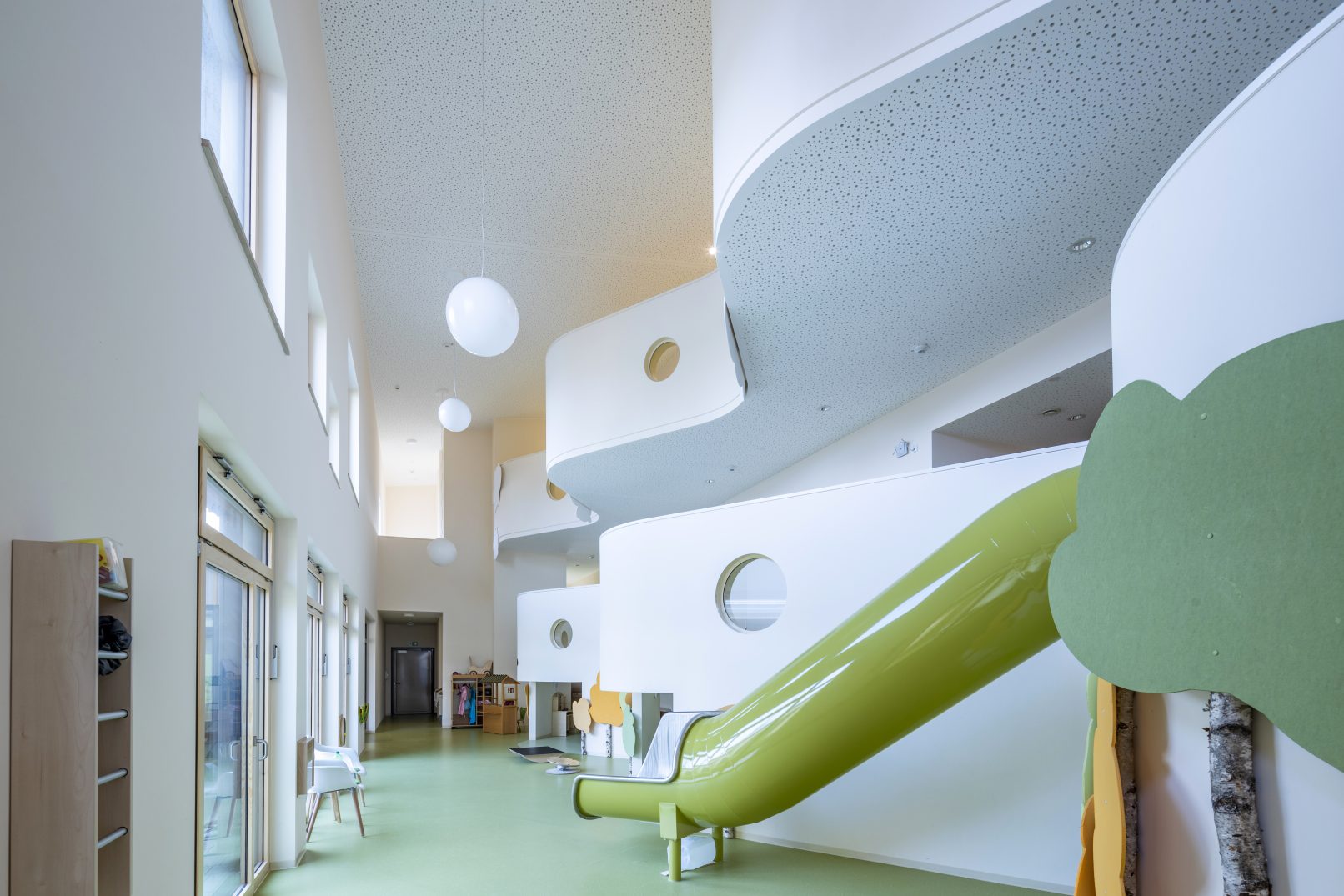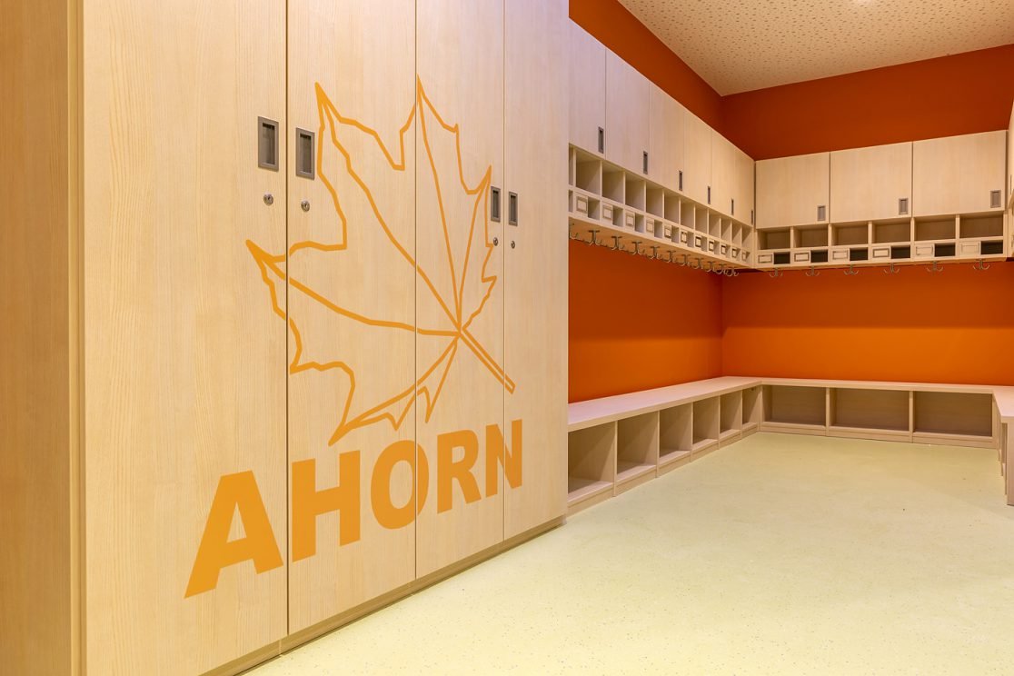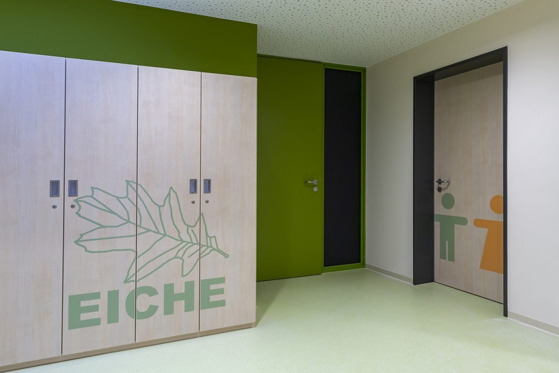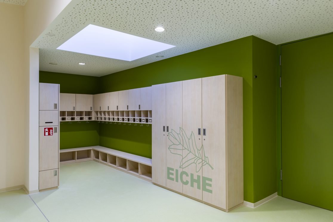 - Farb- und Materialkonzept, Garderoben, Küchen und Kinderküchen, feste Einbauten, Spielnischen und -höhlen und Rutschen. Innenräumliche Gestaltung und Erstausstattung – wie immer in enger Abstimmung mit Bauherr, Nutzer und Personal – dieser mit sieben Gruppen doch großen Kindertagesstätte.