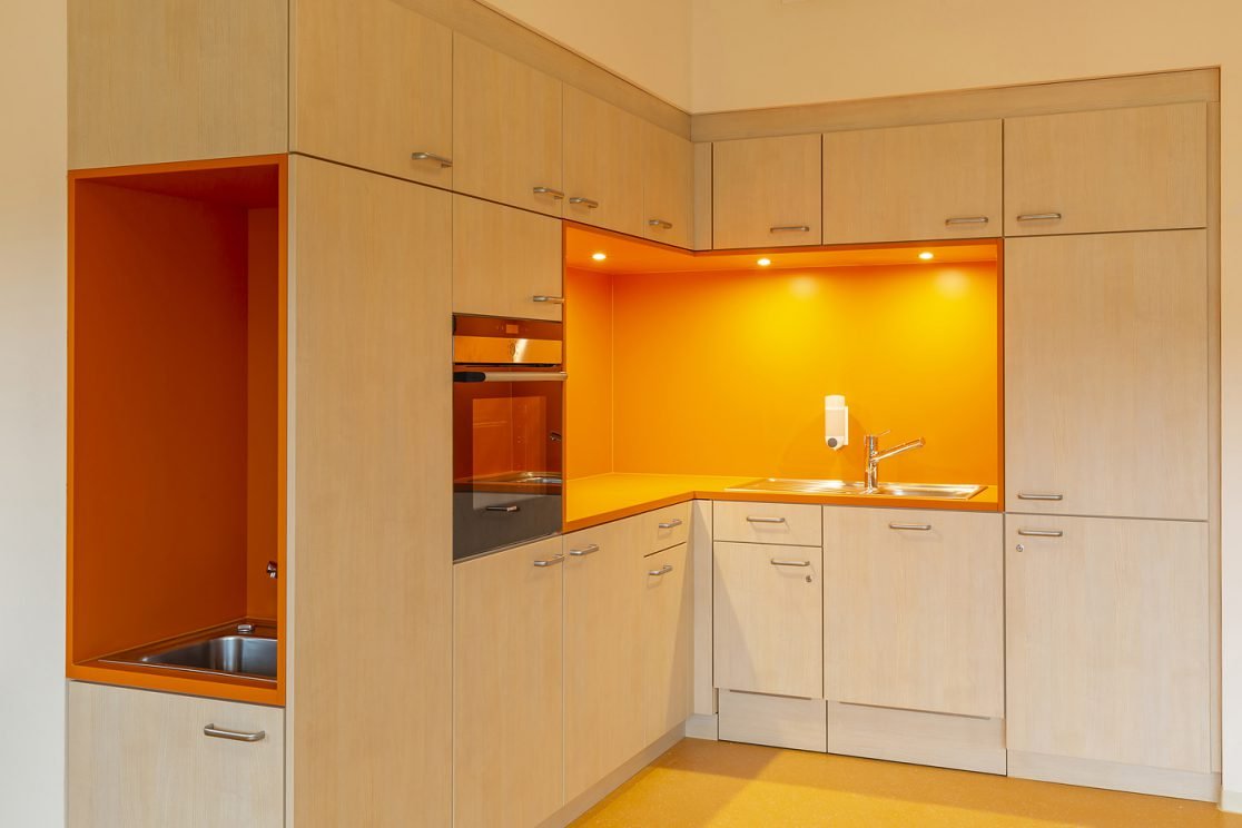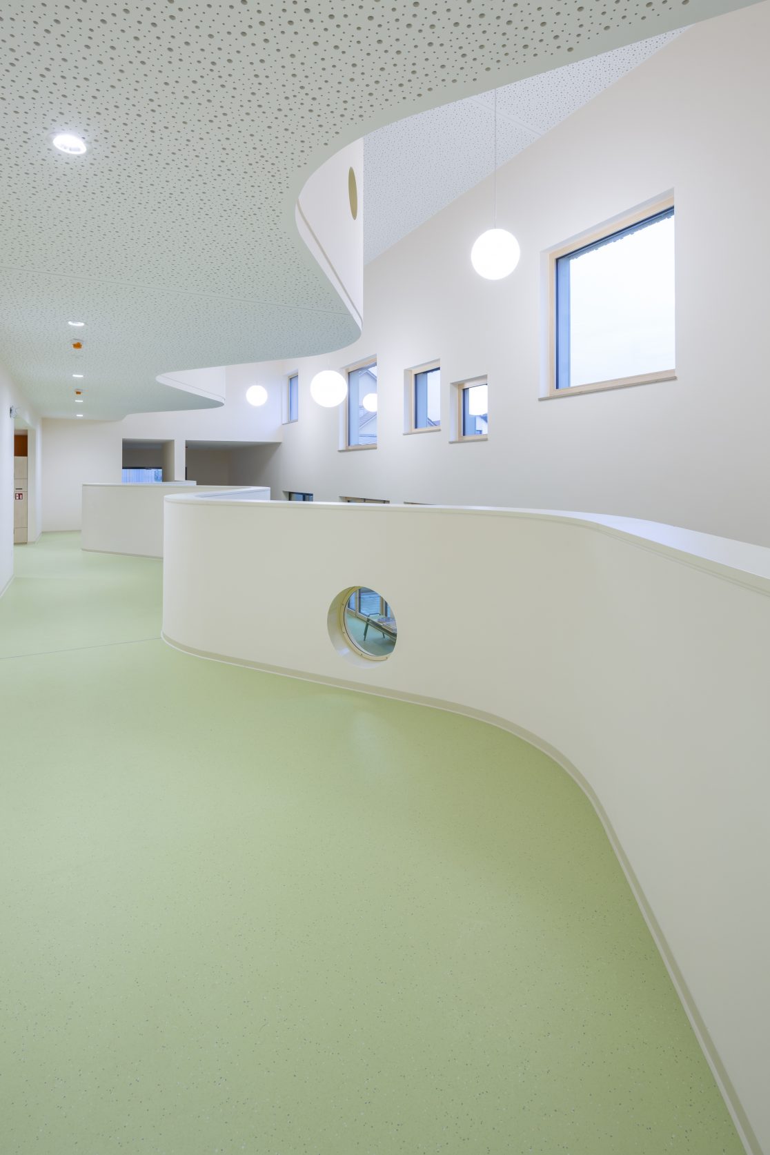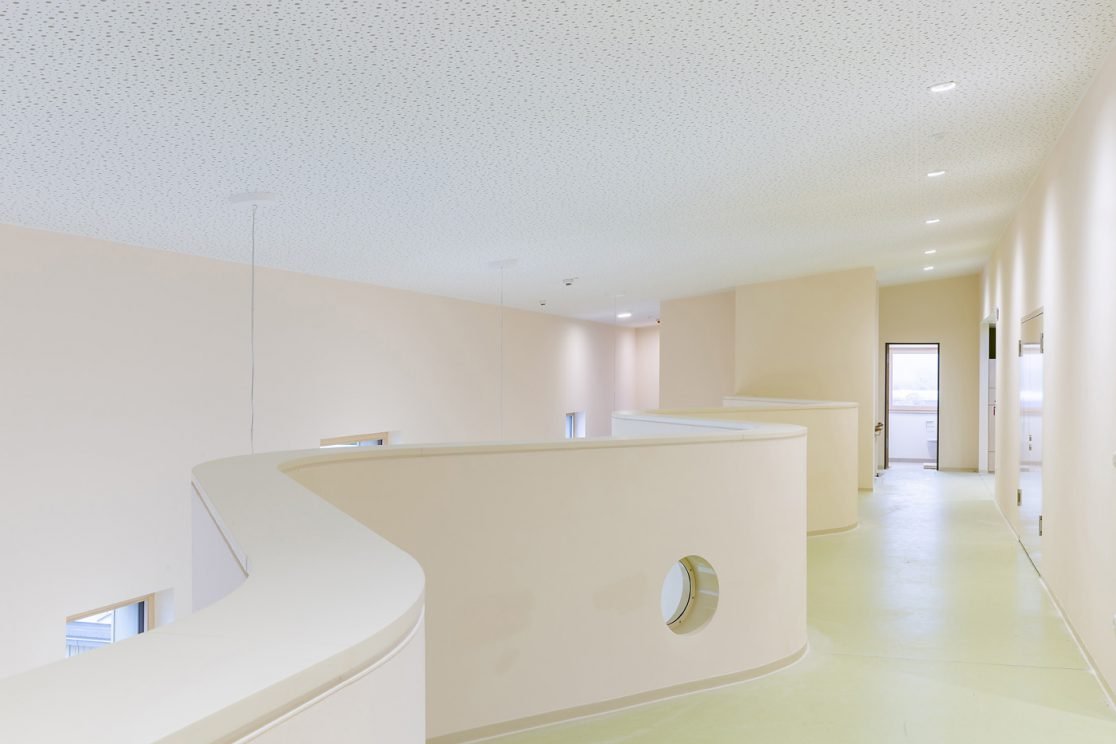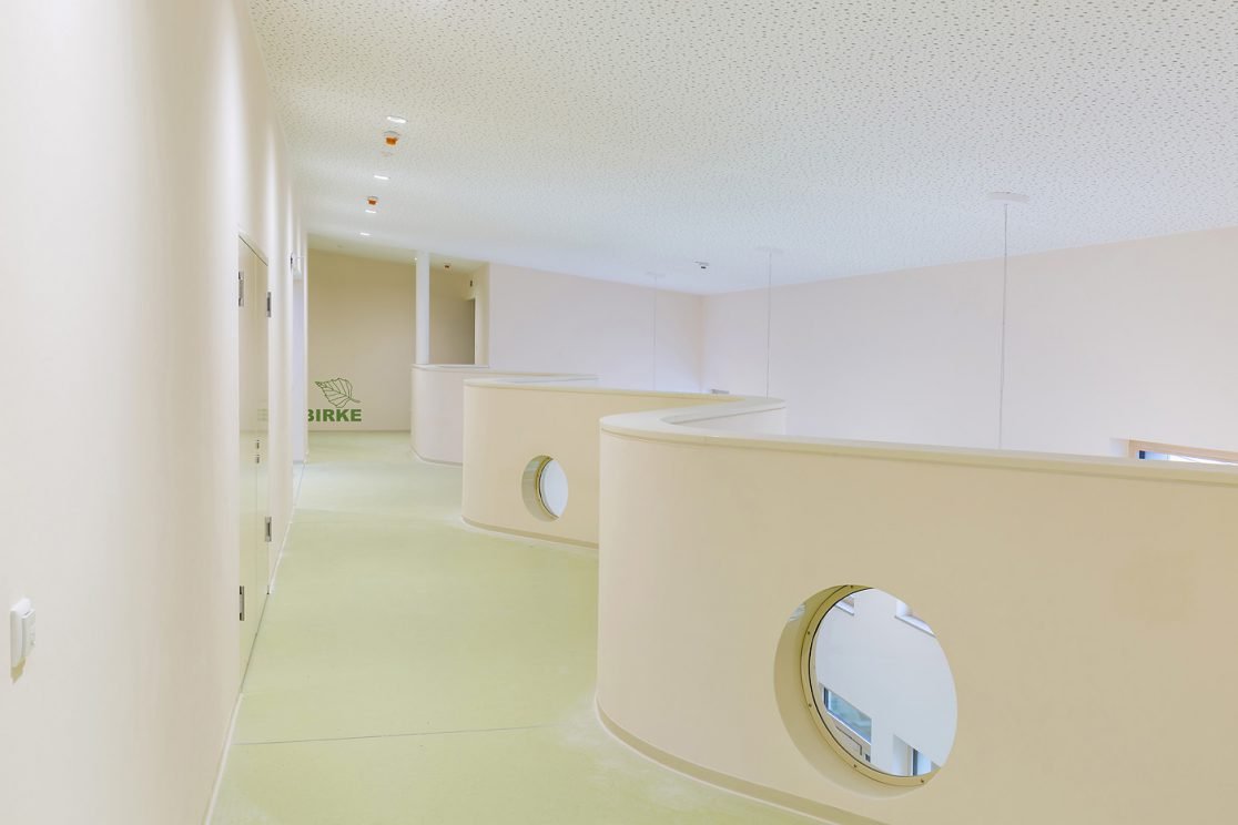- Farb- und Materialkonzept, Garderoben, Küchen und Kinderküchen, feste Einbauten, Spielnischen und -höhlen und Rutschen. Innenräumliche Gestaltung und Erstausstattung – wie immer in enger Abstimmung mit Bauherr, Nutzer und Personal – dieser mit sieben Gruppen doch großen Kindertagesstätte.