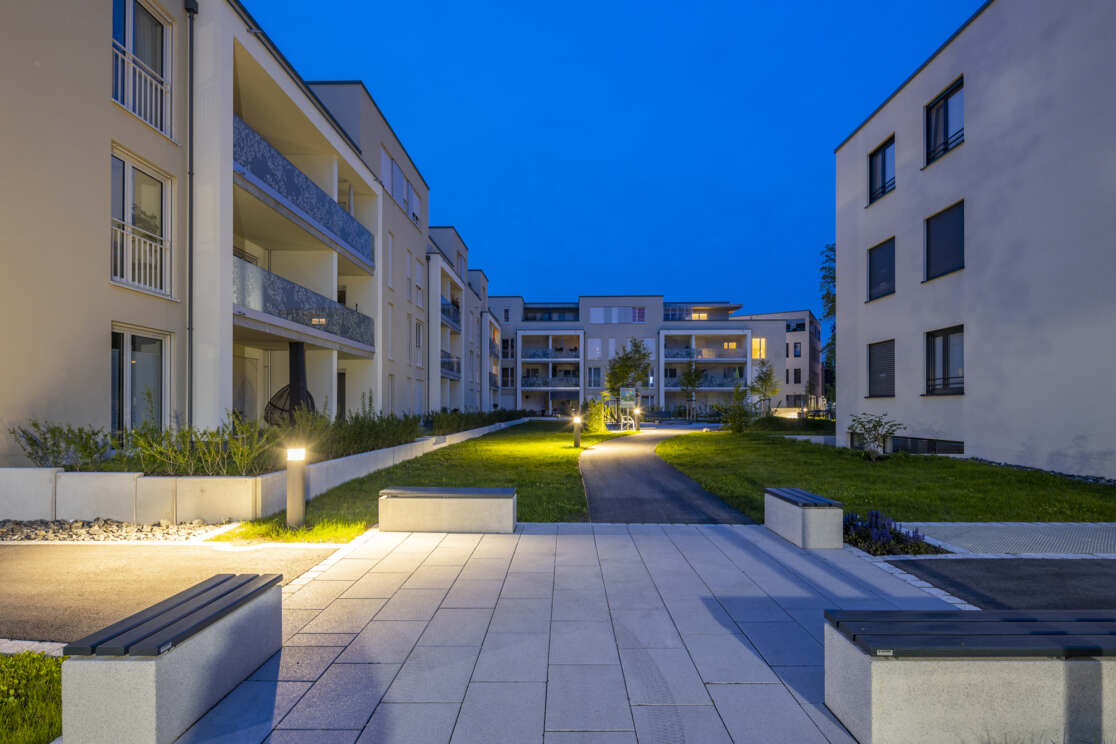 - Durch die Setzung der 4 neuen Gebäude entstehen mit der baumbestandenen Nord-/Ostecke und einem ruhigen Innenhof, zwei halböffentliche, mit dem Straßen-/Wegenetz der Umgebung und der parkähnlichen Grünanlage des 1. Bauabschnitts verbundene Bereiche mit hohen Nutzungs-/Aufenthaltsqualitäten.