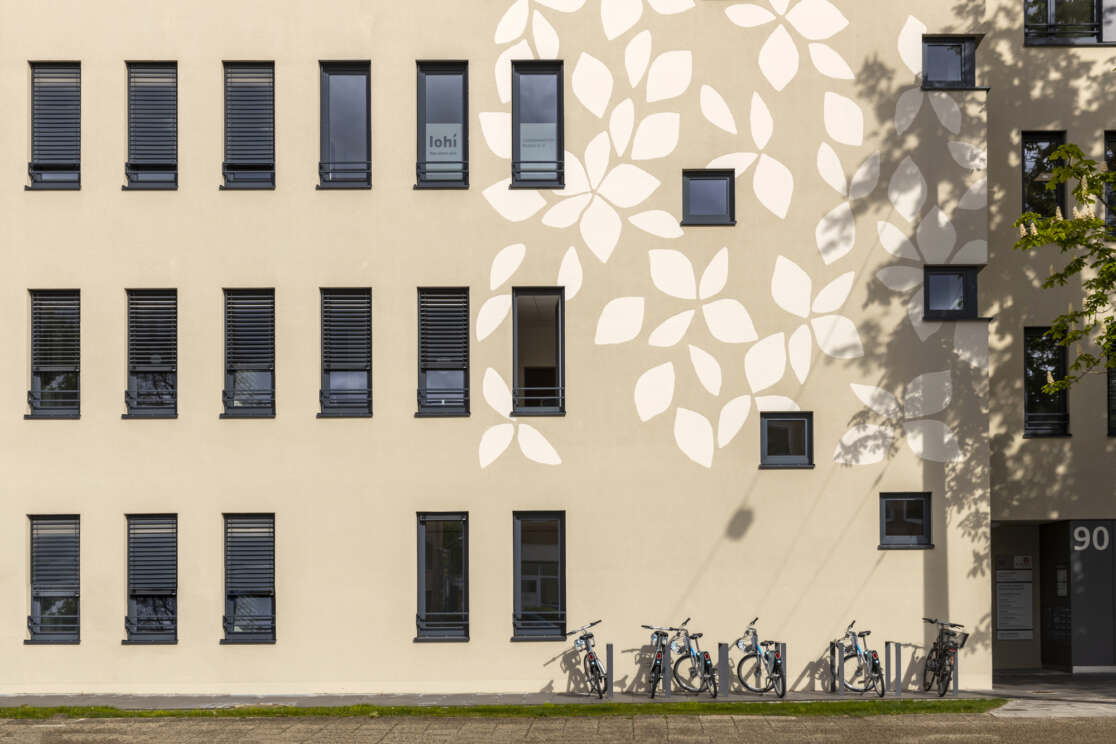 - Die Fassadengestaltung mit verputzten, durch farblich abgesetzte Fassadenplatten gegliederten, Lochfassaden vermittelt zwischen der Bebauung des Antonviertels und dem 1. Bauabschnitt.