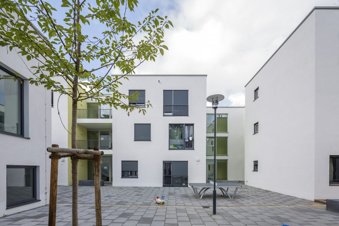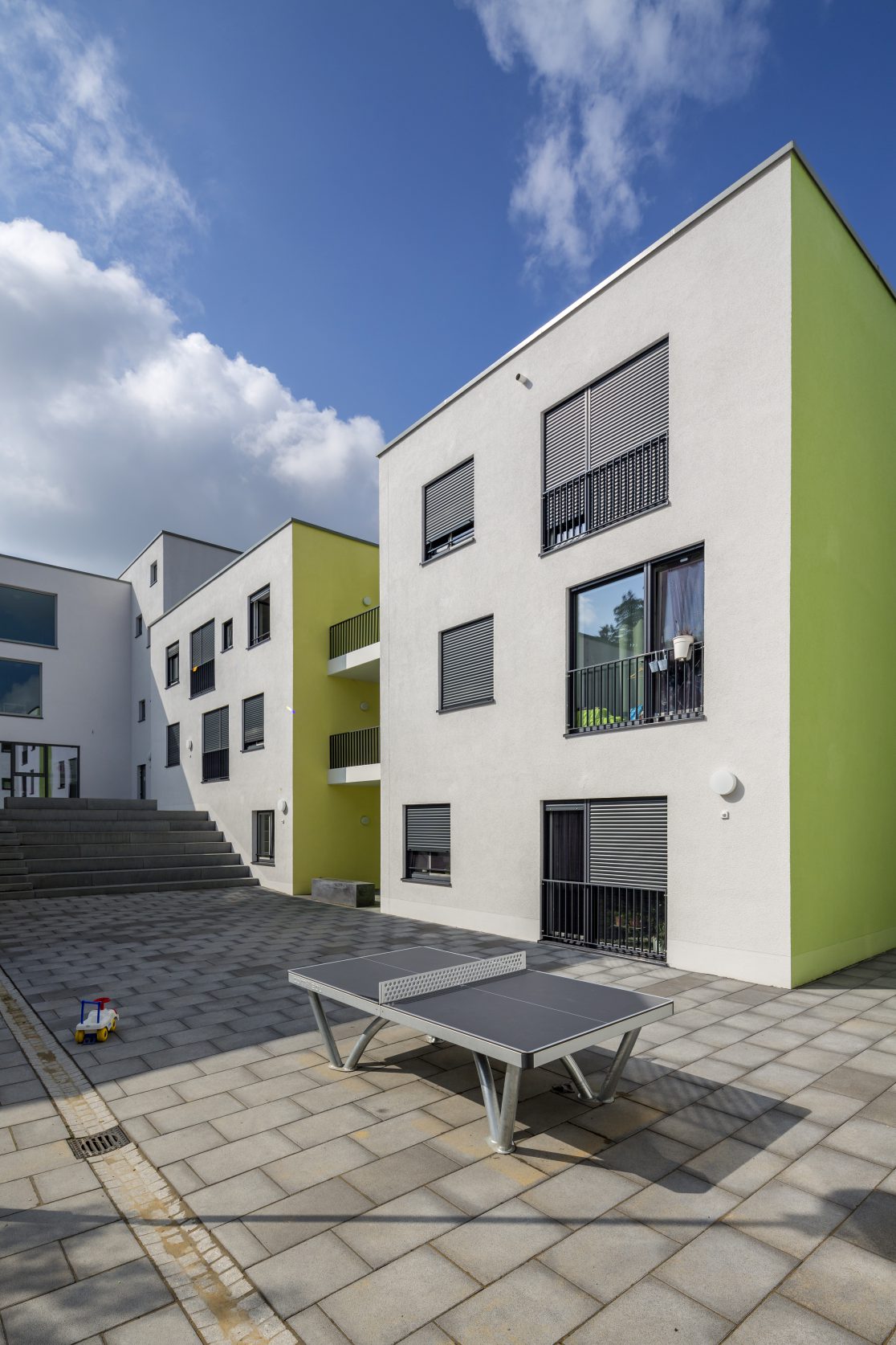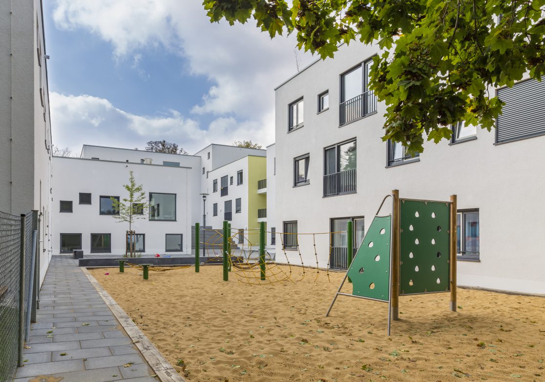 - Neubau einer modellhaften Einrichtung mit 28 barrierefreien bzw. behindertengerechten Wohnungen, Betreuungsräumlichkeiten, einem Gemeinschaftsbereich, einem „Tante-Emma-Laden“ mit Cafe und einer Kindertagesstätte mit zwei Krippen-/eine Kindergarten- und eine Hortgruppe.