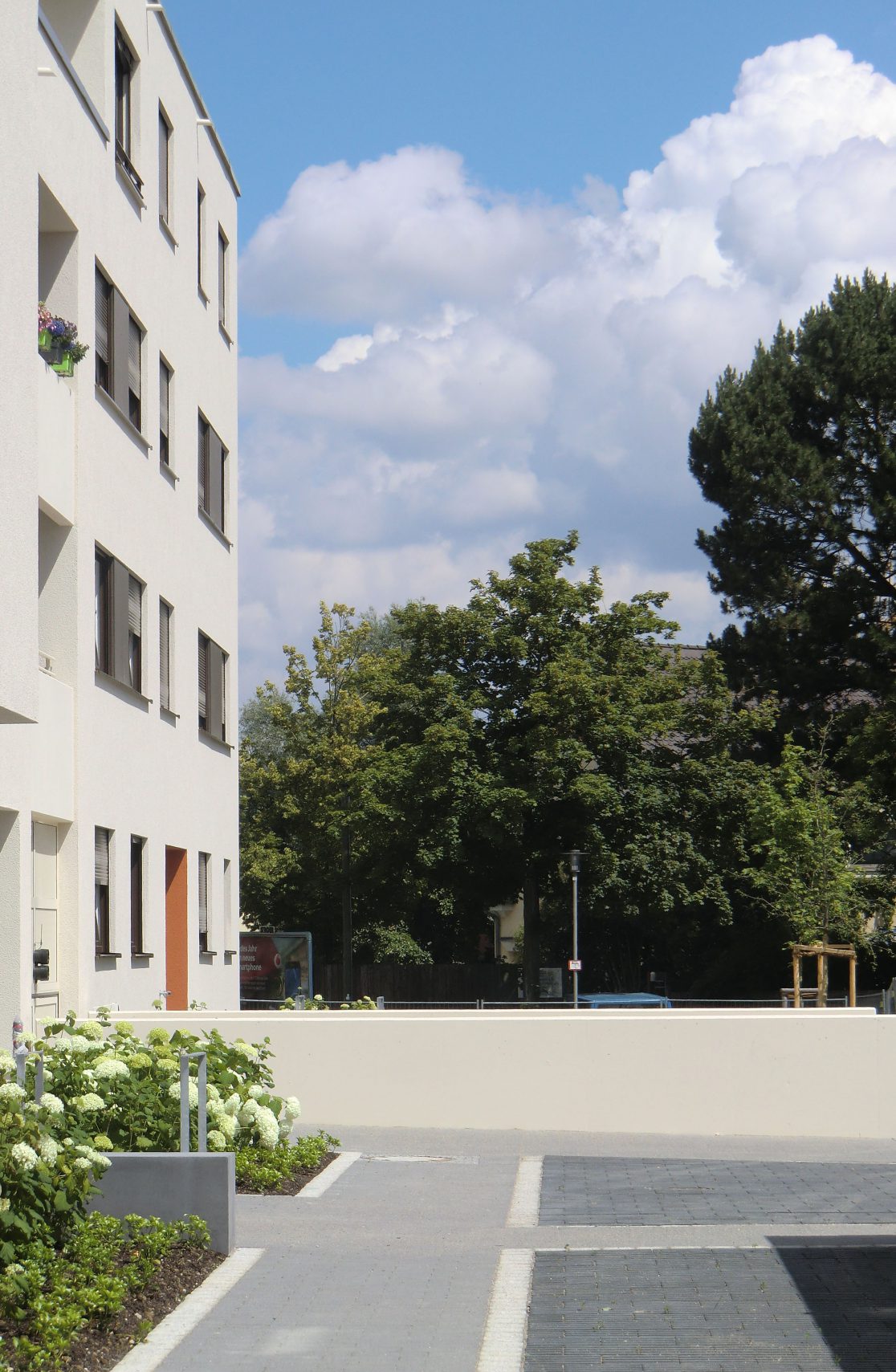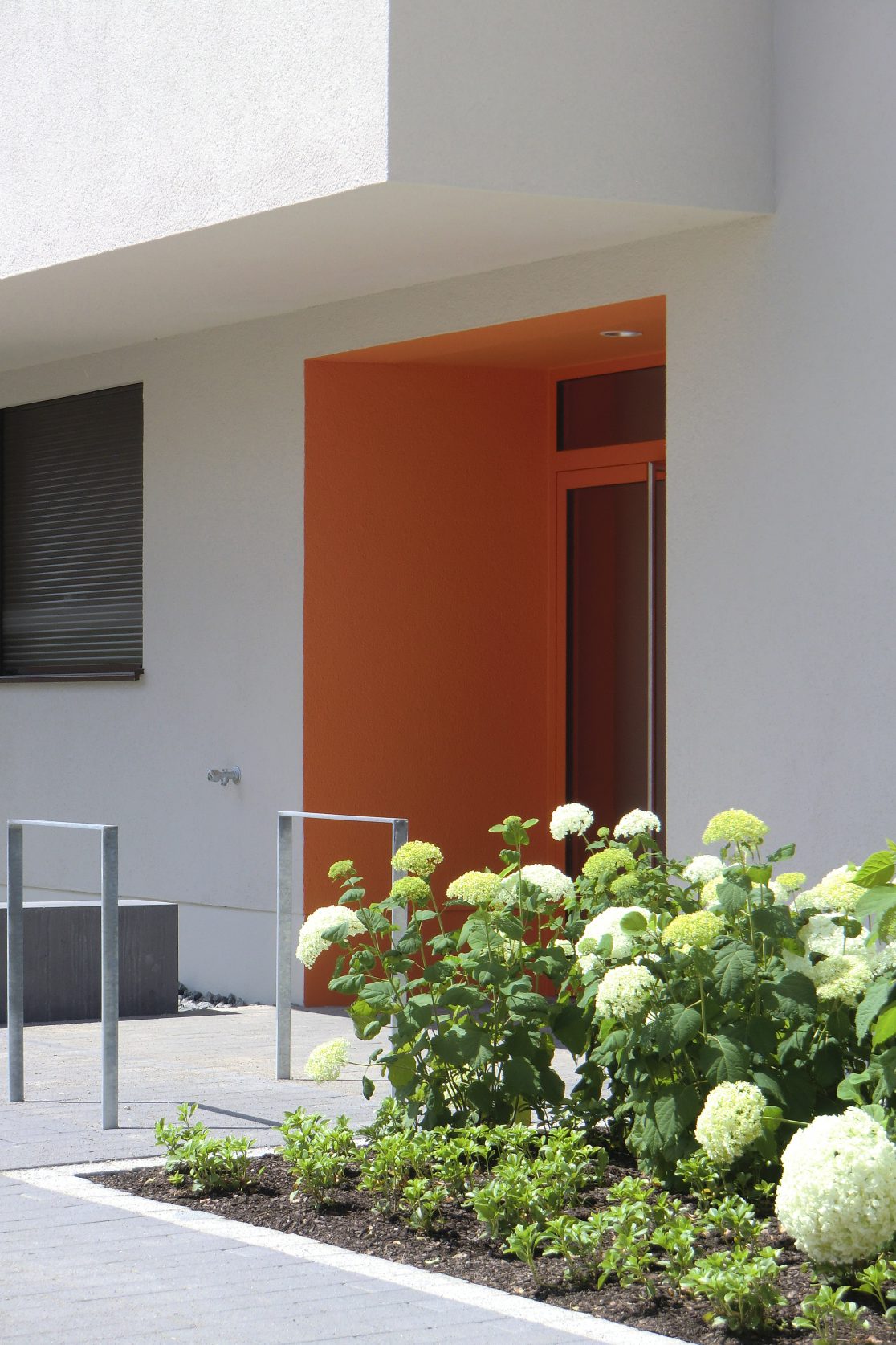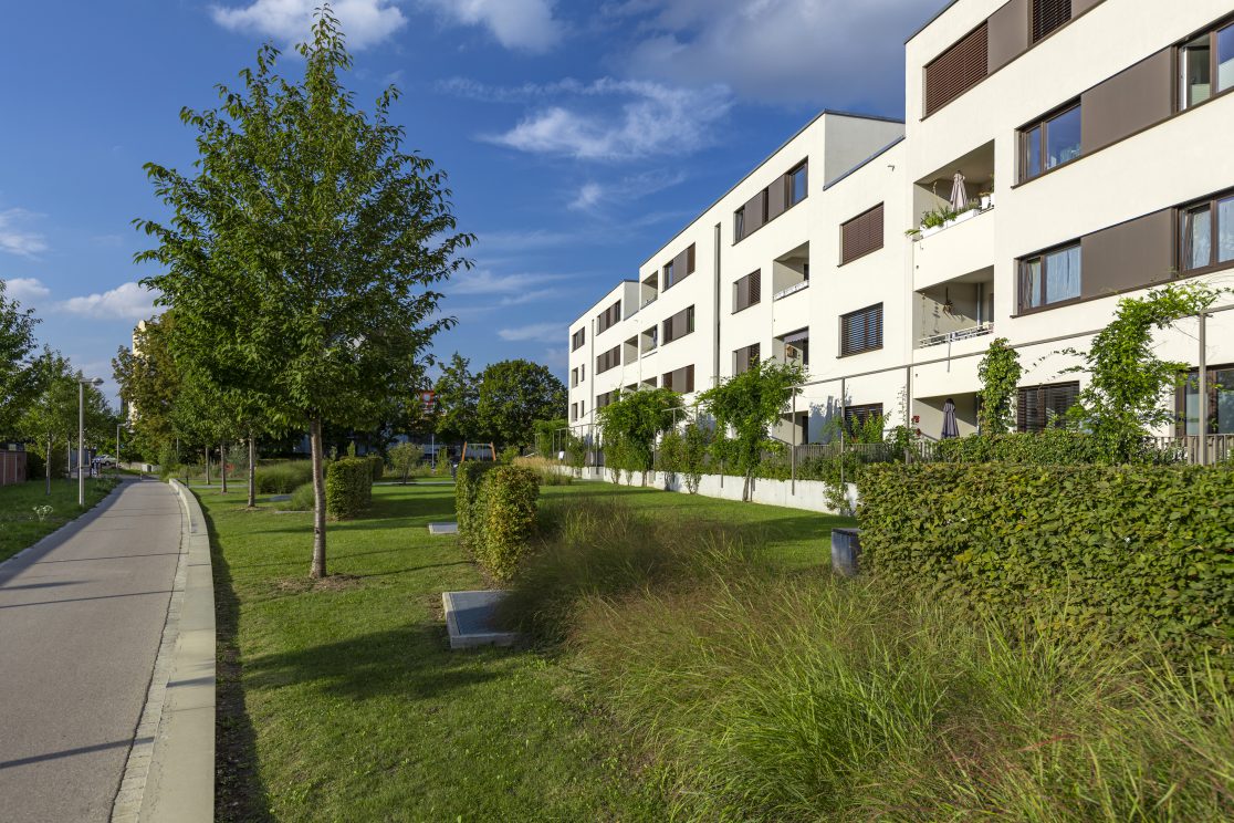 - Die „laute“ Westseite des viergeschossigen Baukörpers grenzt an eine vielbefahrene Stadtstraße. Alle Schlafräume sind in Folge zur „ruhigen“ Ostseite hin orientiert, die Wohn- und Aufenthaltsräume sind – mit Blick nach Westen zur Oberstadt Augsburgs – durchgesteckt und dadurch zweiseitig belichtet. Die privaten Terrassen im EG sind höhenmäßig von den Gemeinschaftsflächen abgesetzt, zwei öffentlich zugängliche Durchgänge verbinden die innere Erschließung mit einem Fuß-/Radweg entlang der Nagahama-Allee.